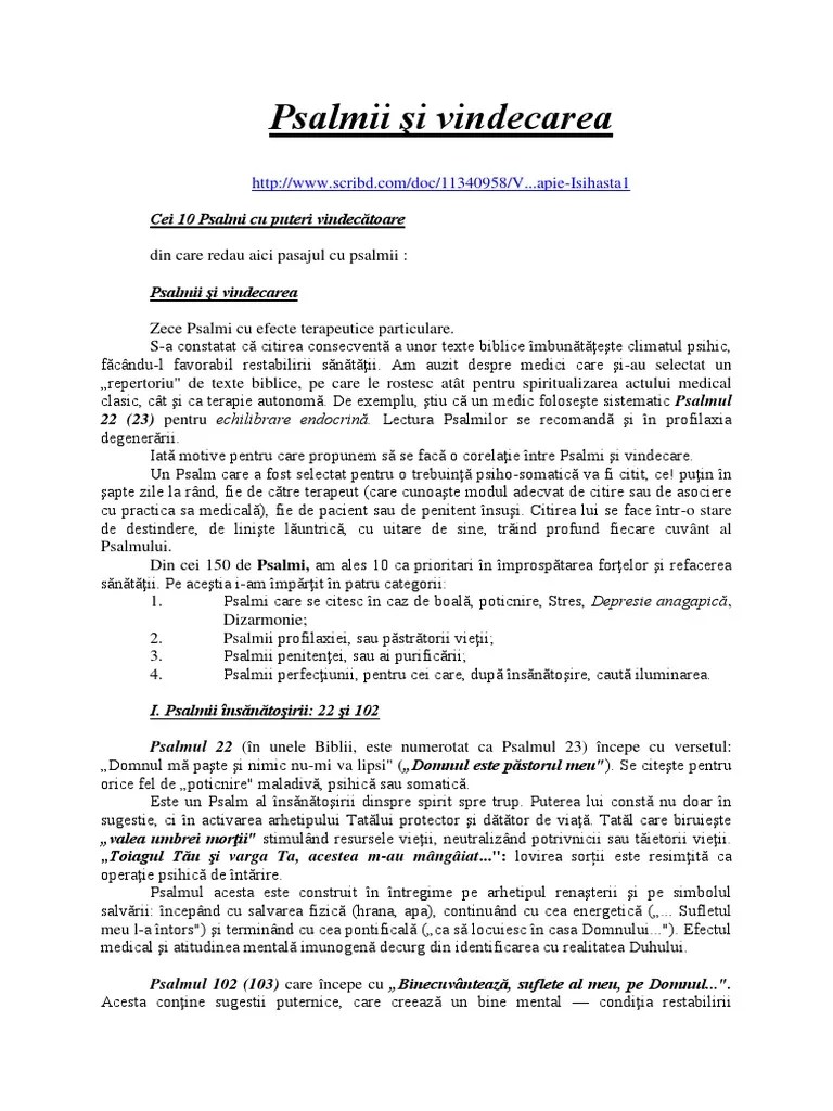 31/08/2017 · ca nu cumva vreunul din ei să pătimească ceva rău pentru noi, păcătoșii, nici în veacul de acum și nici în cel ce va să fie. Tu, doamne dumnezeul nostru, caută din înălțime ca un bun asupra inimilor noastre, care sunt lipsite de dragoste și de unire și sunt înboldite de spinii urii și ai altor păcate. Redau mai jos care sunt cazurile pentru care sfântul arsenie capadocianul citea diferiți psalmi.